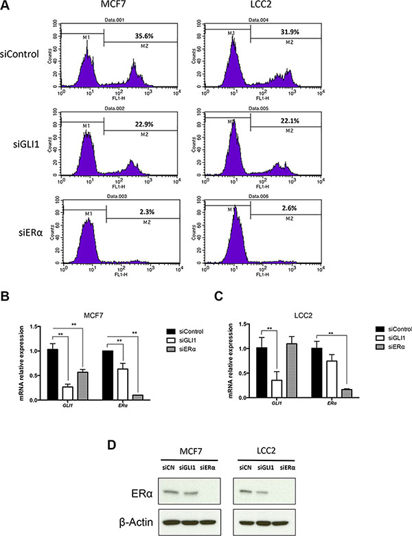Figure 2: Depletion of GLI1 or ERα reduces the proliferation of MCF7 and LCC2 cells. (A) MCF7 and LCC2 cells, cultured for 48 hours following transfection with control siRNA (siControl), GLI1 siRNA (siGLI1) or ERα siRNA (siERα), were subjected to the EdU incorporation assay for 1 hour. The percentage of cells labeled with Alexa Fluor 488 azide was detected by flow cytometry. The expression of GLI1 and ERα in MCF7 (B) and LCC2 (C) cells, following siRNA knockdown of GLI1 or ERα, was determined by real-time PCR. Data are represented as relative expression (2-ΔΔCt values), calculated by subtracting the Ct value of the housekeeping gene TBP from the Ct value of the interrogated transcripts (ΔCt), and normalized to the ΔCt value obtained with control siRNA. Representative data from one of three independent experiments are shown. Error bars indicate the standard deviation. **, Statistical significant, P < 0.01, compared to control, calculated by the Student’s t-test. (D) Protein levels of ERα in MCF7 and LCC2 cells, transfected with control siRNA (siCN), GLI1 siRNA (siGLI1) or ERα siRNA (siERα) for 48 hours, was determined by Western blot. β-Actin was used as the endogenous protein control.