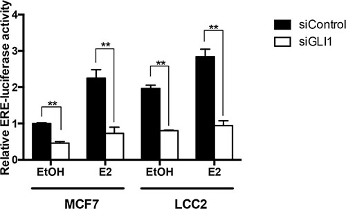 Figure 3: GLI1 depletion reduces the activity of an ERα reporter. MCF7 and LCC2 cells were transfected with control siRNA (siControl) or GLI1 siRNA (siGLI1) and after 24 hours were co-transfected with the reporter plasmid ERE-TK-Luc and the pRL-TK control plasmid. Subsequently, both cell lines were treated with 10 nM E2 or ethanol (EtOH) for 24 hours in serum-deprived medium before harvesting. Luciferase expression was measured 48 hours after plasmid transfection. Shown are data from two independent experiments. Error bars indicate the standard error of the mean (SEM). **, Statistical significant, P < 0.01, compared to control, calculated by the Student’s t-test.