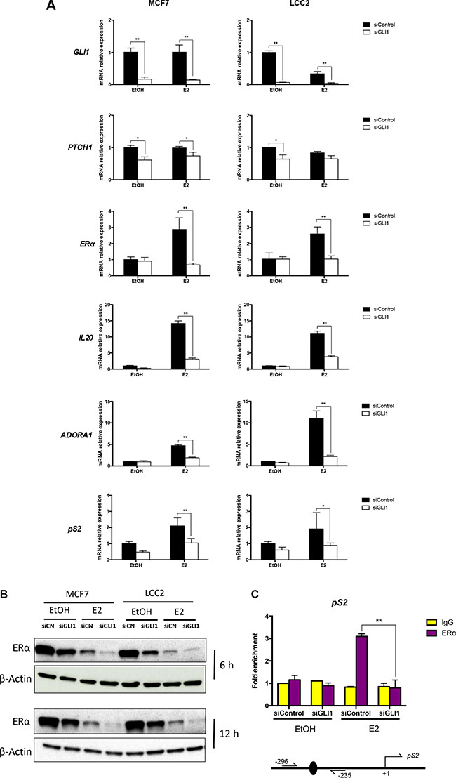 Figure 4: GLI1 depletion reduces the expression of ERα, its target genes and the binding to its targets. (A) The expression of GLI1, PTCH1, ERα and its target genes, IL20, ADORA1 and pS2 in MCF7 and LCC2 cells treated with 10 nM E2 or ethanol (EtOH) for 3 hours in serum-deprived medium, following siRNA knockdown of GLI1, was determined by real-time PCR. Data are represented as relative expression (2−ΔΔCt values), calculated by subtracting the Ct value of the housekeeping gene TBP from the Ct value of the interrogated transcripts (ΔCt), and normalized to the ΔCt value obtained with control siRNA in MCF7/LCC2 cells. Representative data from one of three independent experiments are shown. Error bars indicate the standard deviation. * or **, Statistical significant, P < 0.05 or P < 0.01 respectively, compared to control siRNA, calculated by the Student’s t-test. (B) Protein levels of ERα and β-Actin in MCF7 and LCC2 cells treated with 10 nM E2 or ethanol (EtOH) for 6 and 12 hours in serum-deprived medium, 24 hours after transfection with control siRNA (siCN) or GLI1 siRNA (siGLI1), was determined by Western blot. β-Actin was used as the endogenous protein control. (C) Recruitment of ERα to the promoter of the pS2 gene is diminished following GLI1 depletion. MCF7 cells were transfected with control siRNA or GLI1 siRNA and after 48 hours treated with 10 nM E2 or ethanol (EtOH) for 30 min in serum-deprived medium before harvesting and subjected to ChIP-qPCR analysis with an ERα antibody and PCR primers spanning the ERα binding site at the pS2 gene promoter. The data presented are normalized to input DNA and expressed as fold enrichment over IgG. Shown are data from two independent experiments. Error bars indicate the standard error of the mean (SEM). **, Statistical significant, P < 0.01, compared to IgG control, calculated by the Student’s t-test. A schematic diagram of the promoter region of the pS2 gene, with the transcriptional start sites (+1) indicated by an arrow, the ERα binding site by a black oval and the position of the primers (−296, −235) is also shown. Note the increased ERα binding at the promoter following E2 treatment, which is eliminated by GLI1 depletion.