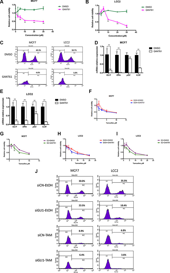 Figure 5: GANT61 increases tamoxifen cytotoxicity, irrespective of the presence or absence of estrogen. (A), (B) GANT61 suppresses the cell viability of MCF7 and LCC2 cells. Both cell lines were treated with 0, 2.5, 5, 10, 20 and 30 μM GANT61 or DMSO as a control. After 48 hours cell viability was determined with the WST-1 assay. Error bars indicate the standard deviation. The two-way ANOVA analysis using Sidak’s multiple comparisons was employed to calculate statistical significance (**P < 0.01). (C) GANT61 treatment reduces the cell proliferation of MCF7 and LCC2 cells. Both cell lines were treated with 10 μM GANT61 or DMSO as a control. After 48 hours cell proliferation was determined by the EdU incorporation assay using flow cytometry. (D), (E) The expression of GLI1, ERα, pS2 and IL20 in MCF7 and LCC2 cells treated with GANT61 or DMSO for 48 hours were measured by real-time PCR. Error bars indicate the standard deviation. **, Statistical significant, P < 0.01 respectively, compared to the DMSO control, calculated by the Student’s t-test. (F–I) MCF7 and LCC2 cells were treated with 10 nM E2 or EtOH and 10 μM GANT61 or DMSO in the presence of different concentrations (0, 1, 2.5, 5, 10 or 20 μM) of tamoxifen, for 48 hours and the number of viable cells was measured with the WST-1 assay using a TECAN plate spectrophotometer. Shown are data from triplicate measurements expressed as percentage of control. Representative data from one of three independent experiments are shown. Error bars indicate the standard deviation. The two-way ANOVA analysis using Sidak’s multiple comparisons was employed to calculate statistical significance (**P < 0.01). (J) MCF7 and LCC2 cells, cultured for 24 hours following transfection with control siRNA (siCN) or GLI1 siRNA (siGLI1) and treated with 10 μM tamoxifen (TAM) or ethanol (EtOH) for 48 hours, were subjected to the EdU incorporation assay for 1 hour. The percentage of cells labeled with Alexa Fluor 488 azide was detected by flow cytometry.