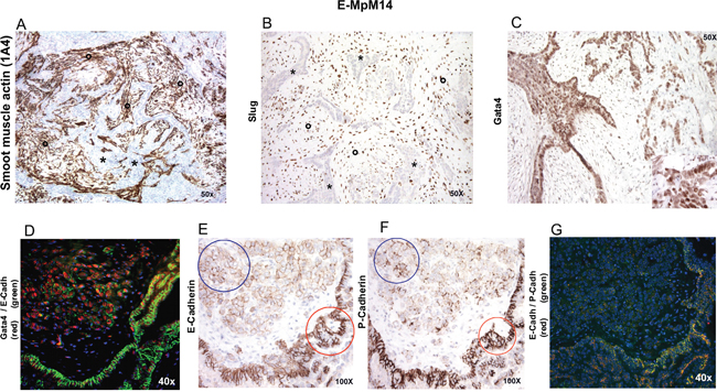 Pluripotent stem cell array analysis of the frozen material also used for the WB experiments revealed three factors in a ground state and therefore characteristics of CSCs: VEGFR2, which was expressed in E-MpM; E-cadherin, a MErT/EMT regulator that was shared by E-MpMs and S-MpMs despite its irrelevant immunophenotypical expression in S-MpMs; and GATA4, a lineage control transcription factor that activates or represses depending on the cell context [40, 41] and was restricted to two E-MpM cases (#14 and #15, Table 1, Figure 2D).