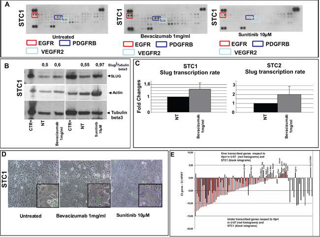 Bevacizumab (Avastin, Roche, Basel, Switzerland) 25 mg/mL was diluted to 1 mg/mL in cell culture medium; sunitinib (Cat. No. S1042, Sellek, Munich, Germany) was diluted to 10 mM in DMSO, and 10 μM used for treatment. After 24 hours of treatment, the proteins were extracted as described in Supplementary Table S2, and 20 μg of the cell extract was investigated by means of WB using the SLUG, actin and Tubulin beta3 antibodies (Supplementary Table S3). VEGFR2 and PDGFRB activation was investigated using a phospho-RTK array kit (Proteome Profiler™ Array, ARY001B, R&D Systems).