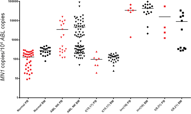 Figure 1: MN1 expression in PB (red dots) and BM (black dots) in samples from healthy volunteers, AML patients with normal karyotype, APL with t(15;17), AML with inv(16) and AML with t(8;21) chromosomal abnormalities. The transcript amount is expressed as MN1 copies/104 ABL copies.