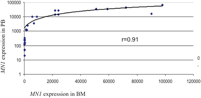 Interestingly, the paired analysis of 47 PB and BM samples collected from the same cohort of patients allowed us to establish a remarkable correlation between MN1 expression in PB and BM. Regression analysis provided an r value of 0.91 (Figure 2).