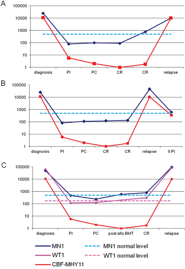 Figure 3: Panel A and B: MN1 transcript expressed as number of copies/104 ABL copies (blue line) and CBFβ-MYH11 transcript expressed as copy number/104 ABL copies (red line) at diagnosis and during follow-up in two patients with inv(16) who relapsed. MN1 increased above the upper normal limit three months before relapse in patient represented in panel A. Panel C: MN1 transcript (blue line), CBFβ-MYH11transcript (red line) and WT1 transcript (pink line) at diagnosis and during follow-up of a patient with an inv(16) alteration who relapsed after two cycles of chemotherapy and allogeneic bone marrow transplantation (allo BMT). MN1 and WT1 increased above the upper normal limit four months before haematological relapse. PI= post induction, PC= post consolidation, CR= complete remission.