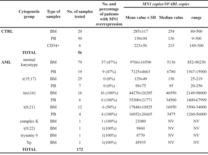 The two main objects of the present study were the identification and characterization of the subset of patients showing MN1 overexpression and the validation of MN1 as a marker for MRD detection.