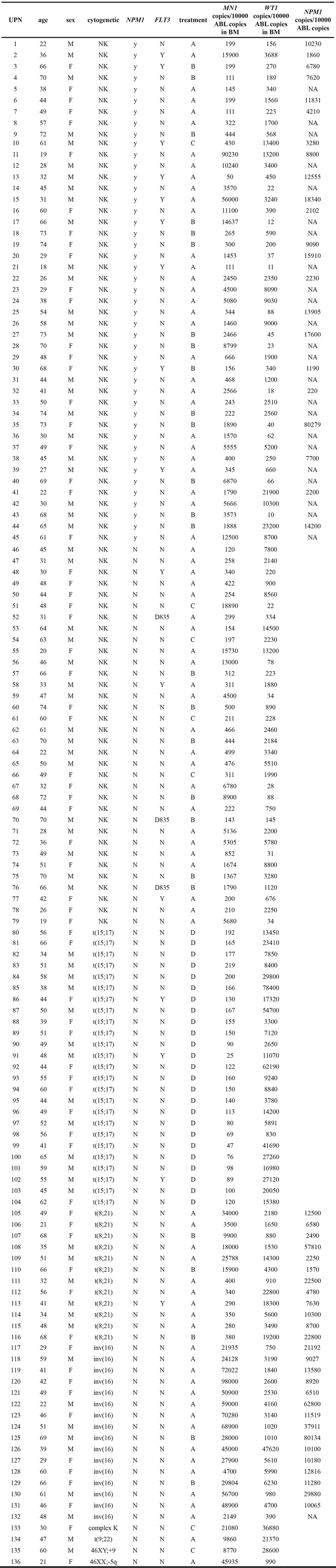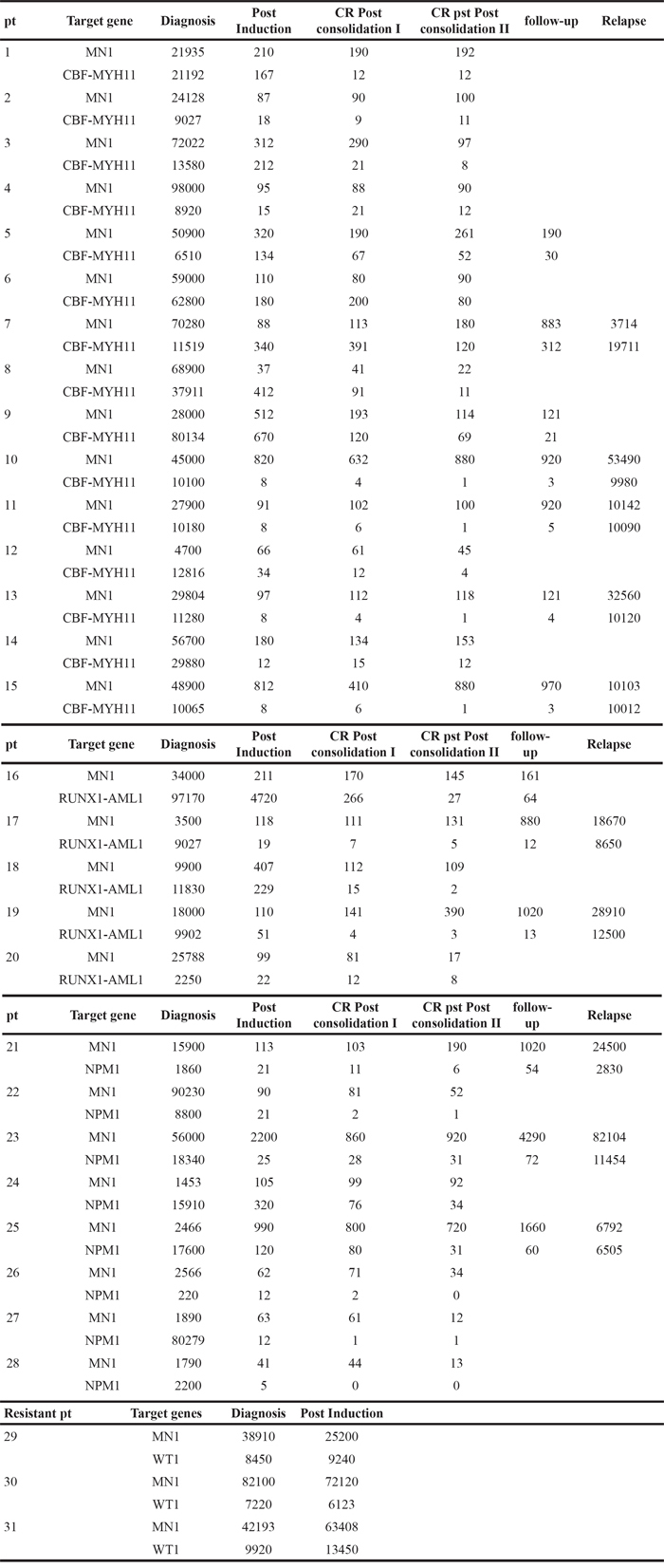 Table 3: Simultaneous evaluation of the expression of MN1 and fusion gene transcript (CBF-MYH11 or RUNX1-AML1) or NMP1 mutation during follow up in patients with AML