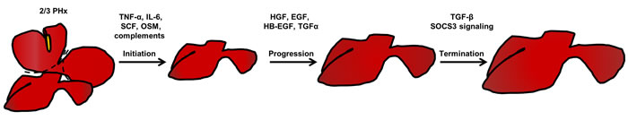 Figure 1: Three phases of liver regeneration after 2/3 partial hepatectomy. After 2/3 partial hepatectomy, an acute phase response initiates the liver regeneration process. In this process, the complement system in the liver is activated, which triggers different cytokines needed for regeneration priming. Among these cytokines, TNF-α and IL-6 are the most important. In addition, SCF and OSM are beneficial for enhancing the effects of these regeneration-promoting cytokines. In response to this, quiescent hepatocytes enter the cell cycle (Go to G1 phase). Then, various growth factors, such as HGF, EGF, HB-EGF, and TGF-α further drive the cell cycle to S phase, which is the progression phase of liver regeneration. When the liver re-establishes its normal mass and function, signals terminating the regeneration process, such as TGF-β and SOCS3 signals, brakes the regeneration process, and the liver accomplishes the regeneration process after 2/3 partial hepatectomy. Abbreviations: TNF-α, tumor necrosis factor-α; IL-6, interlukin-6; SCF, stem cell factor; OSM, Oncostatin M; HGF, hepatocyte growth factor; EGF, epidermal growth factor; HB-EGF, heparin-binding epidermal growth factor; TGF-α, transforming growth factor-α; TGF-β, transforming growth factor-β; SOCS3, Suppressor Of Cytokine Signaling 3.