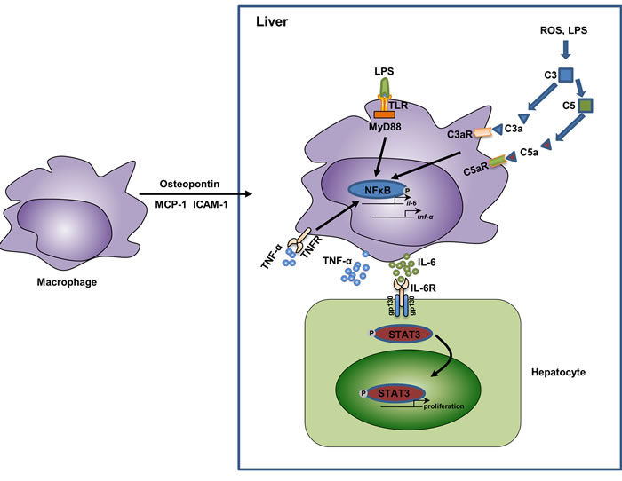 Figure 2: The relationship of macrophage activation, cytokine secretion, and liver regeneration. In response to partial hepatectomy, the liver shows an acute phase response, during which the liver is enriched in several chemotaxis mediators for macrophages, such as osteopontin (mainly secreted by biliary epithelial cells [47]), MCP-1 (mainly secreted by hepatic stellate cells and biliary epithelial cells [130, 131] ), and ICAM-1 (mainly secreted by sinusoidal endothelial cells [40]). In the liver, the increased levels of LPS as well as reactive oxygen species (ROS) activate the complement system and the TLR/MyD88 pathway in macrophages. This leads to the activation of NFκB and results in the release of inflammatory cytokines TNF-α and IL-6. TNF-α could function in an autocrine manner and further activate NFκB. IL-6 binds to its receptors on hepatocytes and activate STAT3 signaling, thus promote the proliferation of hepatocytes. Abbreviations: MCP-1, monocyte chemoattractant protein-1; ICAM-1, intercellular adhesion molecule 1; ROS, reactive oxygen species; TNF-α, tumor necrosis factor-α; IL-6, interlukin-6; STAT3, Signal transducer and activator of transcription 3.