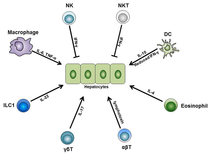 The liver is the largest solid organ within the body. It receives about 20% of its blood supply from the hepatic artery and 80% from the portal vein [1-3]. Owing to its anatomical location and blood supply, the liver is the first line of defense against various blood-borne pathogens and is very important to host immunity and survival [3-6]. To accomplish its immunological roles, the liver is enriched in several subsets of innate (such as macrophages, NK cells, NKT cells, neutrophils, γδT cells, dendritic cells, innate lymphoid cells) [6-8] and adaptive immune cells (such as T cells and B cells) [3, 9], which are finely tuned to affect the status of immuno-tolerance, pathogen clearance, tumor progression, and acute injury of the liver (refer to Table 1 for the information of non-parenchymal cell subsets in the liver) [3, 6, 7, 10].