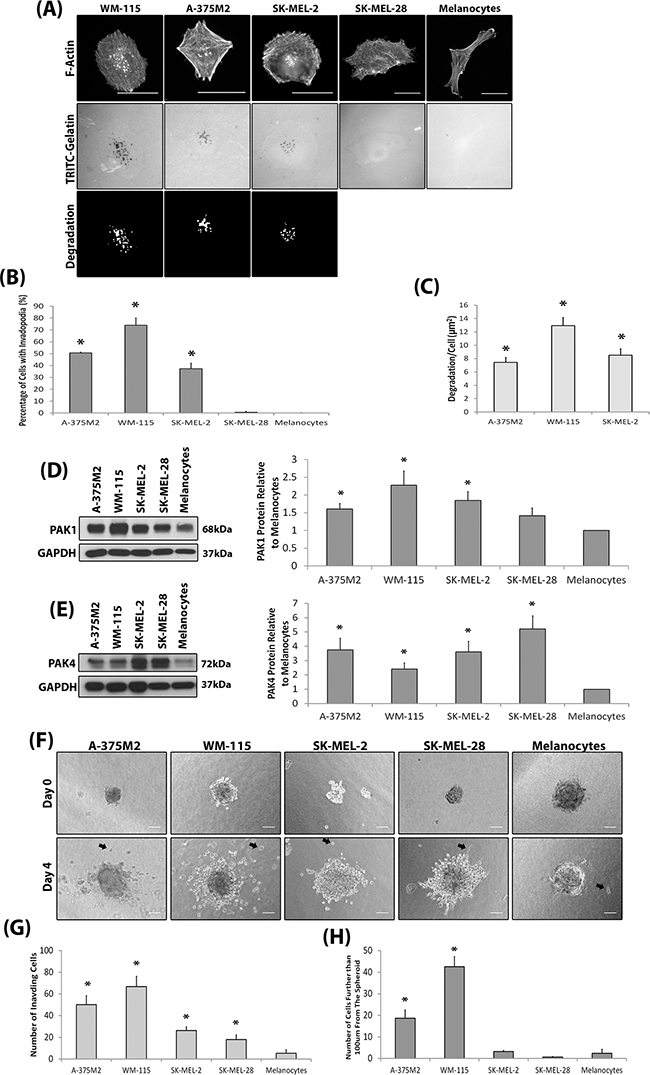 Figure 1: Invasive melanoma cell lines overexpress PAK. A. Representative invadopodia assay images. Cells were seeded on rhodamine conjugated gelatin for 3 hrs and stained for F-actin. Actin rich dots corresponding with gelatin degraded dots were counted as invadopodia. The degradation was measured using ImageJ software. Scale bars = 20μm. B. The percentage of cells with invadopodia. Significance was calculated to a melanocyte control. 150 cells, over 3 independent experiments; * = P 00< 0.05. C. The area of degradation from invadopodia per cell. Significance was calculated between all cell lines. 90 invadopodia producing cells, over 3 independent experiments; * = P 00< 0.05. D-E. Western blot of PAK1 (D) and PAK4 (E) expression in melanoma cell lines compared to melanocytes. over 3 independent experiments; *= P 00< 0.05. Densitometric data were normalized to a GAPDH loading control. F. Spheroid assay. Examples of invading cells are indicated by black arrows. Scale bar = 100μm. G. Quantification of the number of cells that had invaded surrounding matrix H. the number of cells that invaded further than 100μm from the spheroid mass. Cells were seeded as determined by a proliferation assay (Supplementary Figure S1B). Significance was calculated to melanocytes. of 9 spheroids over 3 independent experiments; * = P 00< 0.05. In all cases data are mean values ± S.E.M.