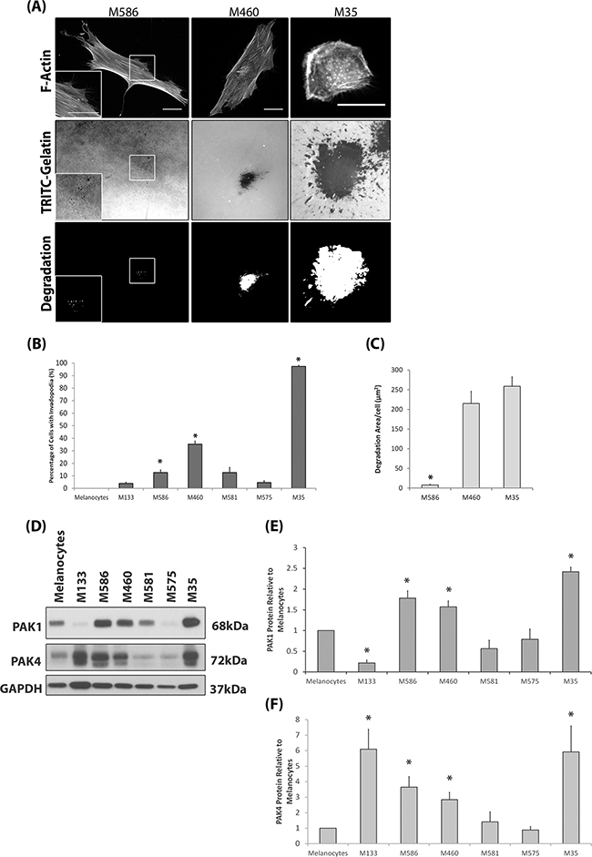 Figure 2: Invasive Patient Derived Cell Strains Overexpress PAK1 and PAK4. A. Representative images of the patient derived cell strain invadopodia assay. Patient derived cell strains were derived from primary (M133, M586 and M460) or metastatic tissue (M581, M575 and M35). Magnification box present in bottom left corner of M586 images, indicated by white borders. Cells were seeded on rhodamine conjugated gelatin for 24hrs and stained for F-actin. Invadopodia were scored as described in Figure 1. The degradation was measured using ImageJ software. Scale bars = 20μm. B. The percentage of cells with invadopodia. Significance was calculated to melanocytes. of 150 cells, over 3 independent experiments; * = P 00< 0.05. C. The area of degradation per cell. Significance was calculated between all cell lines. 90 invadopodia producing cells, over 3 independent experiments; * = P 00< 0.05. D-F. Western blot of PAK1 and PAK4 protein expression in patient derived cell strains and melanocytes. Significance was calculated to melanocytes (1). 3 independent experiments; *= P 00< 0.05. Densitometric data were normalized to a GAPDH loading control. In all cases data are mean values ± S.E.M.