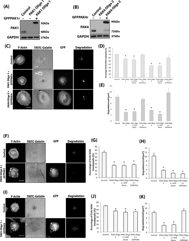 Figure 5: Isoform specific PAK1 and PAK4 functions during the invadopodia lifecycle. A-B. Confirmation of siRNA resistant protein expression in PAK1 (A) or PAK4 (B) siRNA depleted WM-115 cells. C. Representative invadopodia assay images of WM-115 depleted cells transfected with GFPPAK1r or GFPPAK4r. Scale bars = 10μm. D. The percentage of cells with invadopodia and E. the area of degradation from invadopodia. Significance was calculated to control siRNA transfected cells.. of 150 (Percentage) or 90 (Degradation) cells, over 3 independent experiments; * = P 00< 0.05. F. Representative invadopodia assay images of WM-115 PAK4 knockdown cells transfected with GFP alone or GFPPAK1. Scale bars = 10μm. G. The percentage of cells with invadopodia. Significance was calculated to control siRNA transfected cells. 150 cells, over 3 independent experiments; * = P 00< 0.05. H. The area of degradation from invadopodia per cell. Significance was calculated to control siRNA transfected cells. 90 invadopodia producing cells, over 3 independent experiments; * = P 00< 0.05. Control = cells transfected with non-specific siRNA. I. Representative invadopodia assay images of WM-115 PAK1 knockdown cells transfected with GFP alone or GFPPAK4. Scale bars = 10μm. J. The percentage of cells with invadopodia. Significance was calculated to control siRNA transfected cells. 150 cells, over 3 independent experiments; * = P 00< 0.05. K. The area of degradation from invadopodia per cell. Significance was calculated to control siRNA transfected cells. 90 invadopodia producing cells, over 3 independent experiments; * = P 00< 0.05. Control = cells transfected with non-specific siRNA. In all cases data are mean values ± S.E.M