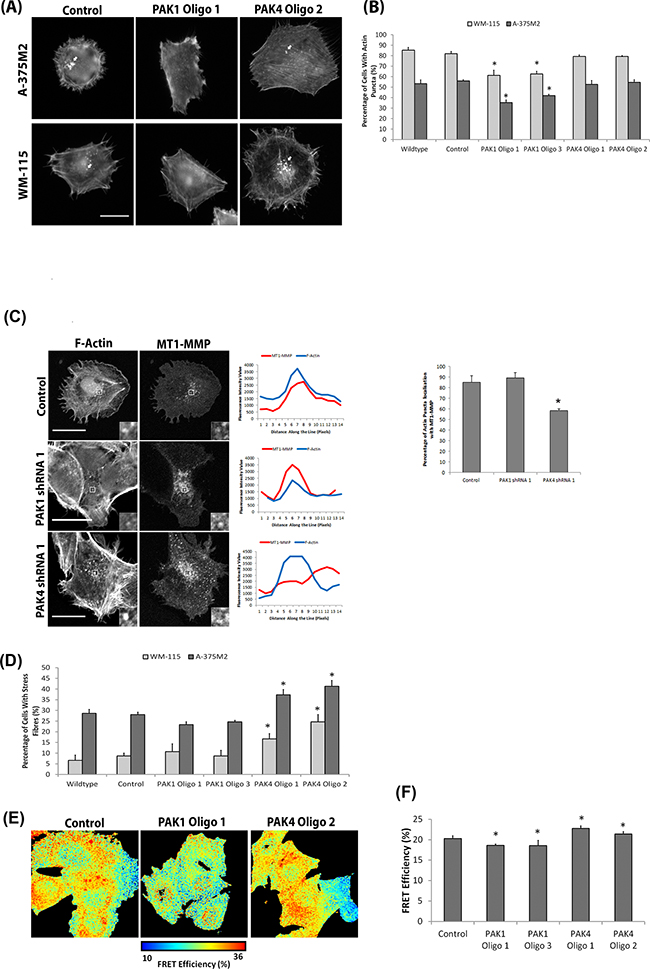 Figure 6: Differential PAK1 and PAK4 signalling in invasive cells. A. Representative F-actin images of WM-115 and A-375M2 cells with deleted PAK1 and PAK4 expression (individually and simultaneously). Scale bar = 10μm. B. The percentage of cells with actin puncta on gelatin. Significance was calculated to wildtype cells. 150 cells, over 3 independent experiments; * = P 00< 0.05. C. Co-localisation of mCherry-MT1-MMP with F-actin on gelatin. Scale bar = 20μm. The percentage of cells with actin puncta localisation with MT1-MMP. Significance was calculated to wildtype cells. 30 cells, over 3 independent experiments; * = P 00< 0.05. D. Percentage of WM-115 and A-375M2 cells with prominent actin fibres on gelatin. Significance was calculated to wildtype cells. 150 cells, over 3 independent experiments; * = P 00< 0.05. E-F. FRET analysis of RhoA activation in A-375M2 RhoA cells in which PAK1 and PAK4 expression was diminished. Significance was calculated to control cells over 3 independent experiments; * = P 00< 0.05. In all cases data are mean values ± S.E.M.