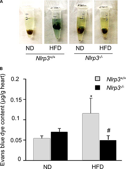 Figure 1: Nlrp3 gene deletion prevents high fat diet-induced vascular hyperpermeability in the myocardium of mice. Mice (Nlrp3+/+ or Nlrp3−/−) were fed with normal diet (ND) or high fat diet (HFD) and then the vascular permeability of mouse hearts to Evans blue dyes was assessed as described in Methods. (A) Representative images of hearts before extraction and (B) summarized data show the effects of HFD on the concentration of Evans blue dyes in mouse hearts isolated from Nlrp3+/+ or Nlrp3−/− mice (n = 5–8). *P < 0.05 vs. Nlrp3+/+ ND; #P < 0.05 vs. Nlrp3+/+ with HFD.
