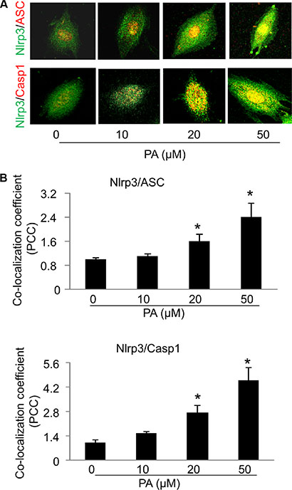 Figure 2: Palmitate increases the formation of Nlrp3 inflammasome complexes in MVECs. (A) Representative confocal fluorescence images depict the effect of palmitate (PA: 0–50 μM; 24 hours) on the co-localization of Nlrp3 with ASC or caspase-1 (casp1). (B) Summarized data show the colocalization efficiency of Nlrp3 with ASC (n = 6–8) or Nlrp3 with caspase-1 (n = 3–6). *P < 0.05 versus control group.