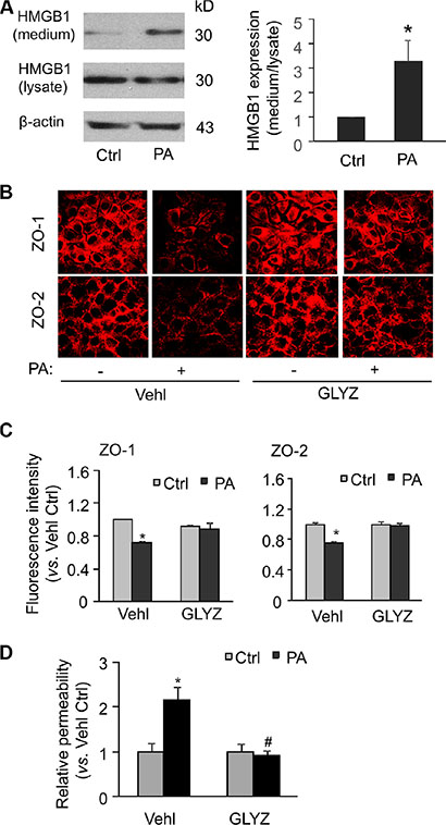 Figure 5: HMGB1 inhibitor glycyrrhizin abolishes palmitate-induced tight junction disruption and enhanced permeability in MVECs. MVECs were stimulated with 20 μM palmitate in the presence of PBS (Vehl for vehicle) or HMGB1 inhibitor glycyrrhizin (GLYZ, 130 μM). (A) Western blot documents and summarized data showing the expression of HMGB1 in either cell culture medium (Medium) or cell homogenates (lysate) (n = 4). (B) Representative fluorescence images show the cell membrane fluorescence of ZO-1 and ZO-2 from at least three independent experiments. (C) The protein expression of ZO-1 and ZO-2 were quantified by flow cytometry. Summarized data show the mean fluorescence intensity of ZO-1 or ZO-2 (n = 4). (D) Summarized data show the relative permeability of endothelial monolayers in the inserts for FITC-dextran (n = 4–8). *P < 0.05 versus Vehl Ctrl; #P < 0.05 vs. Vehl with PA.