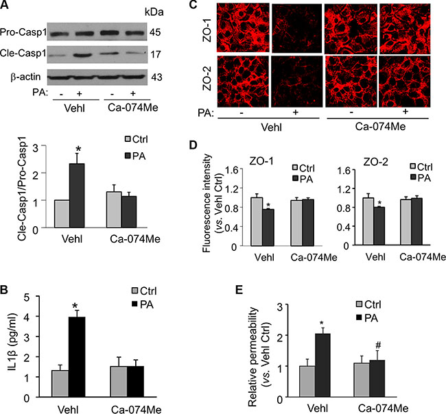 Recent studies have demonstrated that palmitate activates the Nlrp3 inflammasome in bone marrow macrophages through a mechanism that involves the lysosome and its protease cathepsin B [31]. Here, we tested whether palmitate could also stimulate Nlrp3 inflammasomes in a cathepsin B-dependent manner in endothelial cells. As shown in Figure 6A and 6B, palmitate-induced caspase-1 activation and IL-1β production were both prevented in MVECs treated with cathepsin B inhibitor Ca-074Me (Sigma). Furthermore, inhibition of cathepsin B using Ca-074Me also abolished the palmitate-induced disruption of tight junction proteins ZO-1/ZO-2 (Figure 6C and 6D) and enhancement of endothelial permeability in MVECs (Figure 6E). These results suggest that cathepsin B-dependent Nlrp3 inflammasome activation contributes to palmitate-induced tight junction disruption and hyperpermeability in MVECs.