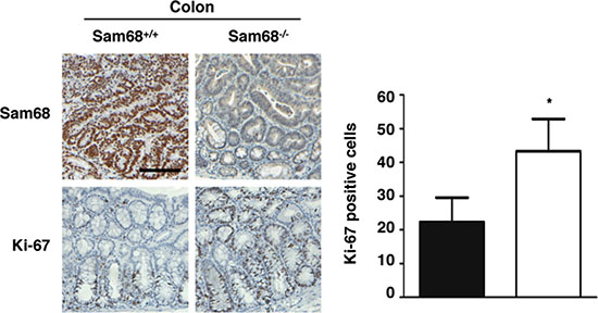 Figure 3: Sam68-deficient mouse colons contain more Ki-67-positive cells. Immunohistochemistry analysis of Sam68 and Ki-67 in colons isolated from AOM-treated p53+/+;Sam68+/+ and p53+/+;Sam68−/− mice. Scale bar, 100 μm. All error bars represent S.D. of the mean (*p ≤ 0.05, **p ≤ 0.005, ***p ≤ 0.0005).