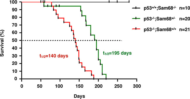 Sam68-haploinsufficiency delayed tumor onset and prolonged survival in p53-deficient mice
