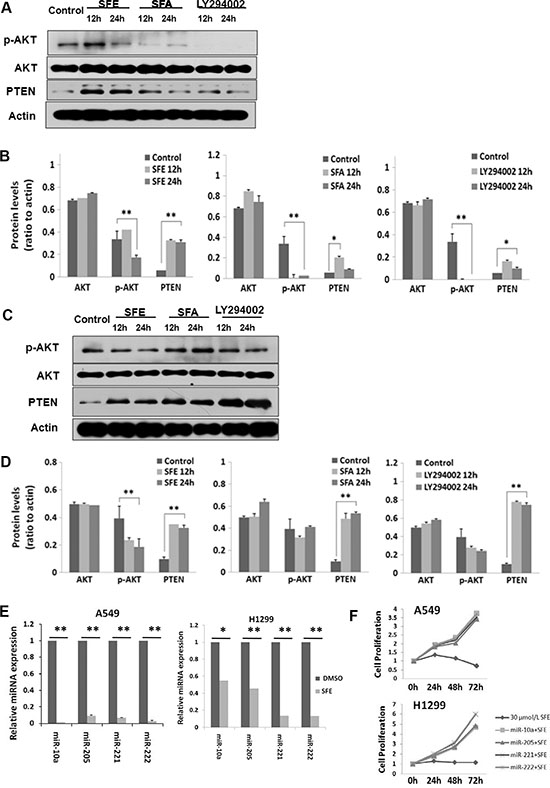 Figure 3: SFE inhibits the PI3K-AKT cell signaling pathway. (A, B) SFE can significantly depress phosphorylated AKT levels and induce PTEN expression in A549 cells. (C, D) SFE can significantly depress phosphorylated AKT levels and induce PTEN expression in H460 cells. (E) SFE can significantly down-regulate miR-10a, miR-205, miR-221, and miR-222 expression in A549 cells. All results of the mean of triplicate assays with standard deviation of the mean are presented. *P < 0.05, **P < 0.01.