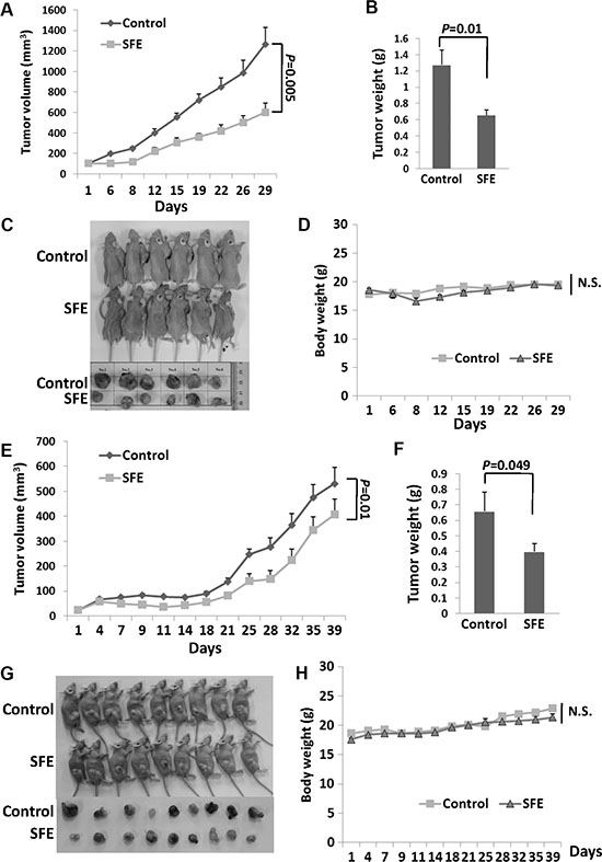 Figure 6: In vivo characterization of the anticancer potential SFE on human xenograft lung cancer tumors. (A–D) Nude Balb/C mice with A549 xenograft treated with SFE via injection administration. (E–H) Nude Balb/C mice with A549 xenograft treated with SFE via oral administration. (A–C, E–G) The growth of tumors from SFE treatment was inhibited significantly compared with that of tumors treated with vehicle control. (D, H) There were no significant differences of mice weight between SFE or vehicle control treated groups. N.S., not significant.