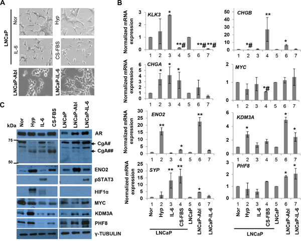 Figure 1: PHF8 and KDM3A are members of the Down-Up expression cluster in the in vitro models of NED and CRPC. A. Phase-contrast images of LNCaP cells cultured under normal conditions (Nor) or following treatment with 1% O2 (Hyp), 20 ng/ml IL-6 (IL-6), or CS-FBS for 6 days, and LNCaP-Abl and LNCaP-IL-6 cells at steady state. B. RT-qPCR of indicated genes from cells cultured as in A. At least three independent experiments were performed, and standard deviation is indicated by bars. *: p<0.05; **: p<0.01; #: downregulation. C. Expression of the indicated proteins, as assessed by western blotting, in cells treated as in A. For CgA, the positions of molecular weight marks are shown. #: precursor CgA; ##: intermediate CgA.