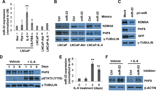 Figure 2: miR-22 mediates the regulation of PHF8 induced by IL-6. A. Expression of miR-22, as assessed by RT-qPCR, in LNCaP cells cultured under normal conditions (Nor) or following treatment with 1% O2 (Hyp), 20 ng/ml IL-6 (IL-6), or CS-FBS for 6 days, and in LNCaP-Abl and LNCaP-IL-6 cells. B. Expression of the indicated proteins, as assessed by western blotting, in LNCaP, LNCaP-Abl, and LNCaP-IL-6 cell lines following transfection with 20 nM control (ctrl) or miR-22 mimics for 48 hours. C. Expression of the indicated proteins, as assessed by western blotting, in LNCaP cells stably overexpressing the GFP (mock) only or GFP-miR-22 construct. D. Expression of the indicated proteins, as assessed by western blotting, in LNCaP cells treated with medium containing 0.1% BSA (Vehicle) or medium containing 20 ng/ml IL-6 (+IL-6), for the indicated number of days. E. Expression of miR-22, as assessed by RT-qPCR, in cells treated with IL-6 as in D. F. Expression of the indicated proteins, as assessed by western blotting, in LNCaP cells transfected with 50 nM control (Ctrl) or miR-22 inhibitor at 72 hours following treatment with vehicle or IL-6 (+IL-6). S.D. in all experiments was obtained from at least three independent experiments. *: p<0.05; **: p<0.01.