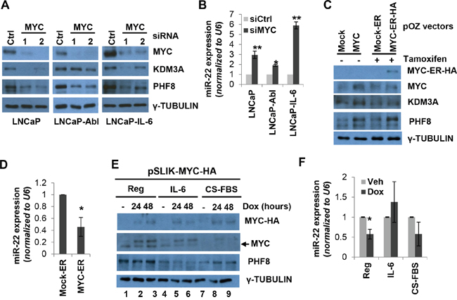 Figure 3: MYC sustains the expression of PHF8 and KDM3A by repressing miR-22. A. Expression of the indicated proteins, as assessed by western blotting, in LNCaP, LNCaP-Abl and LNCaP-IL-6 cells treated with 20 nM scrambled (Ctrl) or MYC siRNA for 60 Hours. B. Expression of miR-22, as assessed by RT-qPCR, in cells treated as in A. C. Expression of the indicated proteins, as assessed by western blotting, in LNCaP cells over-expressing a constitutively active MYC construct and a tamoxifen-inducible mock construct (mock-ER) or MYC-ER-HA. 1 μM tamoxifen was added to the medium for 48 hours. D. Expression of miR-22 in LNCaP cells overexpressing mock-ER or MYC-ER-HA as in C. E. Expression of the indicated proteins, as assessed by western blotting, in LNCaP cells over-expressing a doxycycline-inducible MYC-HA construct and treated with medium containing vehicle (Reg), 20 ng/ml IL-6 (IL-6) or CS-FBS (CS-FBS) for 6 days. Doxycycline (dox) was used at 0.5 μg/ml for the indicated amount of time. F. Expression of miR-22 in LNCaP cells treated as in E as assessed by RT-qPCR. The expression of miR-22 was normalized to the vehicle treatment (no doxycycline). All experiments were performed at least three times independently, and standard deviation is indicated by bars. *: p<0.05; **: p<0.01.