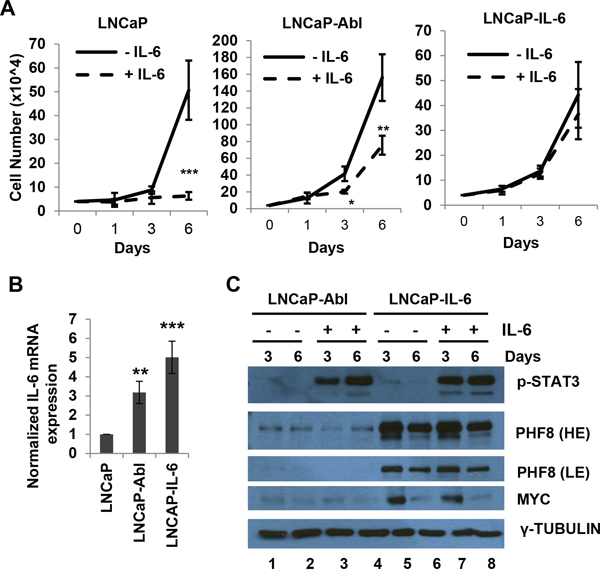 To further investigate the link between MYC and PHF8, we tested how the two proteins respond to IL-6. We used LNCaP and LNCaP-IL-6 cells, which are capable of paracrine and autocrine IL-6 signaling, respectively. In addition, we also included LNCaP-Abl cells, as they represent a model of CRPC, but with unclear secretion status of IL-6. IL-6 treatment inhibited the proliferation of LNCaP cells, but not that of LNCaP-IL-6 cells (Figure 4A), consistent with a previous report [33]. The same treatment only partially inhibited the growth of LNCaP-Abl cells (Figure 4A). RT-PCR showed that LNCaP-IL-6 and LNCaP-Abl cells expressed high and moderate levels of IL-6 mRNA, respectively. Such expression was nearly absent in LNCaP cells (Figure 4B). These results indicate that LNCaP-Abl cells are partially competent for autocrine IL-6 signaling, a finding that may explain the partial resistance of these cells to the growth inhibitory function of exogenous IL-6. Although exogenous IL-6 induced phosphorylation of STAT3, it did not dramatically affect the expression of MYC and PHF8 proteins in LNCaP-Abl and LNCaP-IL-6 cells (Figure 4C, compare lanes 2 and 4, lanes 6 and 8) than that in LNCaP cells (Figure 1C). Notably, both PHF8 and MYC were slightly downregulated in LNCaP-IL6 cells after 6 days of treatment regardless of whether the medium contained IL-6. It is possible that the downregulation of both MYC and PHF8 reflects the point at which the cells reached their proliferation plateau, a cellular phase described previously to alter proliferative gene expression [48]. In sum, the sustained PHF8 and MYC protein levels in both LNCaP-IL-6 and LNCaP-Abl cells tighten the link between MYC and PHF8, and indicates that these two proteins may play key roles in resistance to growth inhibition induced by exogenous IL-6.