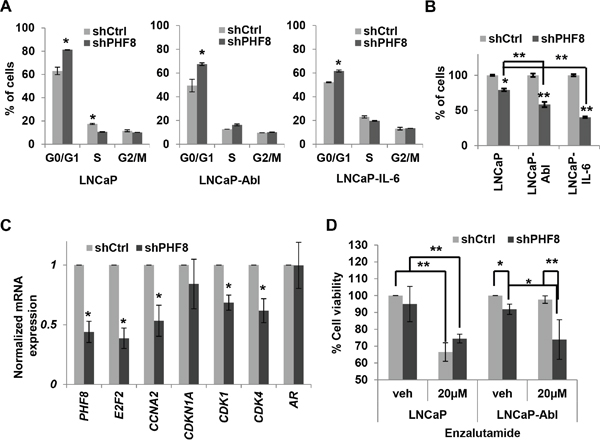Figure 7: PHF8 promotes proliferation by regulating cell cycle genes and sensitizes LNCaP-Abl cells to enzalutamide treatment. A. Cell cycle distributions of LNCaP, LNCaP-Abl and LNCaP-IL6 cells stably expressing doxycycline-inducible scrambled shRNA (Ctrl) or a PHF8 shRNA. B. Percentage of cells in indicated cultures, as described in A. C. Expression of the indicated genes, as assessed by RT-qPCR, in LNCaP-Abl cells treated as in A. D. Cell viability, as determined by MTT assay, in LNCaP and LNCaP-Abl cells in which PHF8 knockdown was induced for 48 hours before DMSO (veh: vehicle) or 20 μM enzalutamide was applied for another 48 hours. All experiments were performed at least three times independently, and standard deviation is shown by bars. *: p<0.05; **: p<0.01.