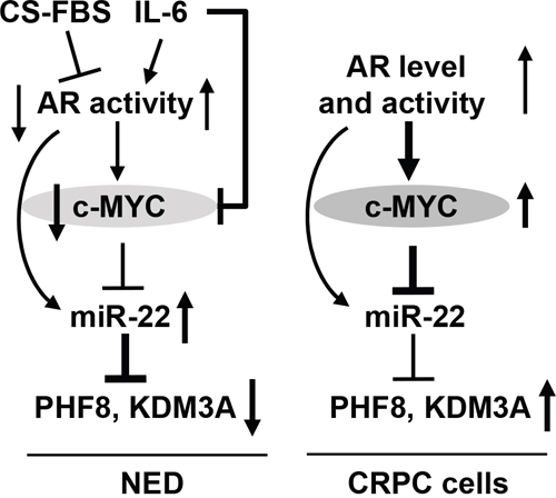 Figure 8: Schematic illustration of the mechanisms underlying the regulation of PHF8 and KDM3A by AR, MYC and miR-22. DuringNED (left), androgen deprivation reduces AR activity and MYC expression, miR-22 is derepressed from the downregulated MYC and consequently, PHF8 and KDM3A are downregulated by the elevated miR-22. Short IL-6 treatment downregulates MYC, although, it increases AR activity. The upregulation of miR-22 can be caused by the elevated AR activity and the derepression from the downregulated MYC. In CRPC cells (right), miR-22 is repressed by MYC, despite of elevated AR activity. The basal expression level of miR-22 partially contributes to the restored expression of PHF8 and KDM3A in CRPC cells.