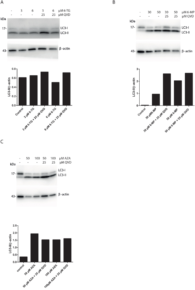 Figure 4: Apoptosis inhibition using QVD promotes autophagy induction in thiopurines treated cells. A. Analysis of LC3 expression in HCT116 MMR-proficient cells. Cells were treated with 6-TG (3 μM or 6 μM) and cotreated with QVD (25 μM) for caspase inhibition. LC3 level of expression were determined by western blotting 72 hours post treatment. Histogram shows the quantitation of LC3-II relatively to β-actin. B. Analysis of LC3 expression in HCT116-MMR proficient cells by western blotting 72 hours post treatment with 6-MP (30 μM or 50 μM) and cotreatment with QVD (25 μM). Histogram shows the quantitation of LC3-II relatively to β-actin. C. Analysis of LC3 expression in HCT116-MMR expressing cells by western blotting 72 hours post treatment with AZA (50 μM or 100 μM) and cotreatment with QVD (25 μM) for caspase inhibition. Histogram shows the quantitation of LC3-II level relatively to β-actin.