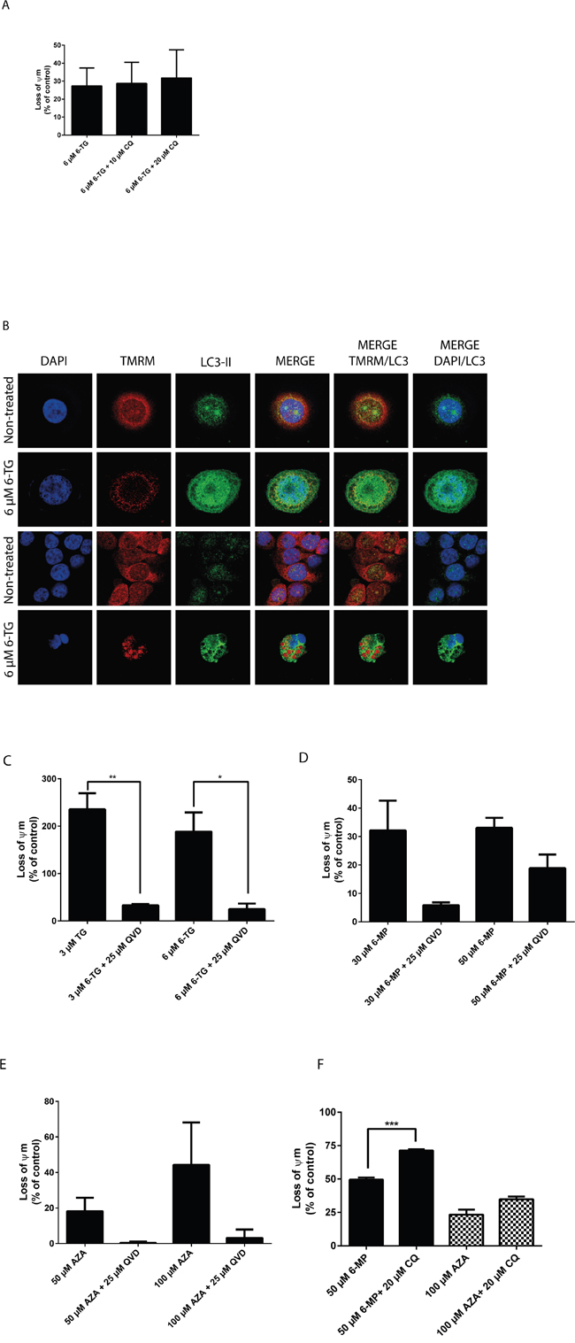Figure 5: Thiopurines induced cell death is at least in part due to the intrinsic apoptotic death pathway. A. Measurement of the mitochondrial potential (Ψm) in HCT116 MMR-expressing cells treated with 6-TG (3 μM or 6 μM) and cotreated with CQ (10 μM or 20 μM). Ψm was determined using the TMRM fluorescent dye and flowcytometry. 6-TG treatment induces a marked decrease in Ψm, which is even greater upon CQ cotreatment. B. Co-localization of the autophagic marker LC3-II and the mitochondria dye TMRM in HCT116-MMR proficient cells treated with 6-TG. Cells were exposed to 6-TG (6 μM) for 24 hours. 72 hours later, cells were stained with TMRM for 15 minutes and then counterstained with LC3-II and analyzed by confocal microscopy. The TMRM dye is rapidly sequestrated by healthy mitochondria while the depolarized mitochondria do not accumulate the dye. The non-treated cells show preserved mitochondria whereas cells treated with 6-TG show disruption in the mitochondrial network and a weak mitochondrial signal relative to damaged mitochondria. Moreover, 6-TG treated cells show LC3-II-associated autophagosomal puncta formation as compared to control cells showing diffuse cytosolic LC3 distribution. Mitochondrial autophagy was further confirmed by LC3 signal colocalization with the mitochondria signal (TMRM). C. Measurement of Ψm in HCT116 MMR-proficient cells treated with 6-TG (3 μM or 6 μM) and cotreated with QVD (25 μM). Results are expressed as percentage loss of Ψm and represent the mean ± SEM of three independent experiments. QVD cotreatment significantly protected cells (P ≤ 0.01) from the loss of Ψm when exposed to 6-TG. D. Measurement of Ψm in HCT116 MMR-proficient cells treated with 6-MP. Results are expressed as percentage loss of Ψm and represent the mean ± SEM of three independent experiments. 6-MP treatment (30 μM or 50 μM) induces a significant decrease in Ψm (P ≤ 0.001). QVD cotreatment protected the cells from the loss of Ψm when exposed to 6-MP. E. Measurement of Ψm in HCT116-MMR-expressing cells treated with AZA. Results are expressed as percentage loss of Ψm and represent the mean ± SEM of three independent experiments. AZA treatment (50 μM or 100 μM) induces a decrease in Ψm. QVD cotreatment (25 μM) protected the cells from the loss of Ψm when exposed to AZA. F. Measurement of Ψm in HT29 cells treated with 6-MP (50 μM) or AZA (100 μM) and cotreated with CQ (20 μM). Results are expressed as percentage loss of Ψm and represent the mean ± SEM of three independent experiments. CQ cotreatment (25 μM) enhanced the loss of Ψm in cells when exposed to 6-MP or AZA.