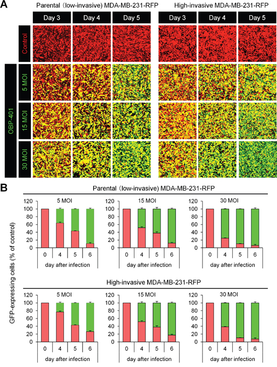 Figure 1: OBP-401 labels low- and high-invasive MDA-MB-231-RFP breast cancer cells in vitro. Low- and high-invasive variants of MDA-MB-231-RFP cells were seeded in 6-well plates (1 × 105 cells a well). OBP-401 was added at the indicated multiplicity of infection (MOI) 24 hours after seeding. Images were acquired with a confocal laser scanning microscope FV1000 (Olympus, Tokyo, Japan). A. Representative images of low- and high-invasive MDA-MB-231-RFP breast cancer cells 3, 4, and 5 days after infection of OBP-401 at the indicated MOI B. Histogram shows the frequency of GFP-expressing parental and highly metastatic MDA-MB-231-RFP breast cancer cells at indicated days after infection of OBP-401. The number of GFP-expressing cells was counted. Data are shown as average ± SD. N = 5.