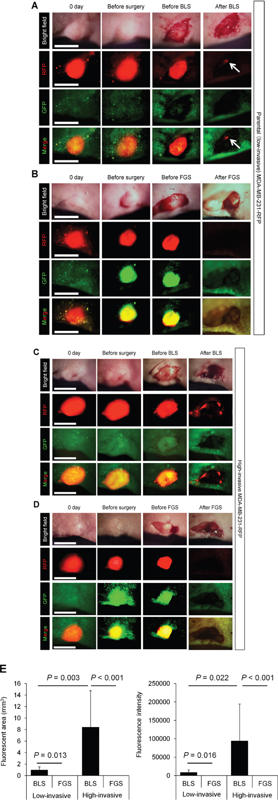 We performed bright (white) light surgery (BLS) on orthotopic low- and high-invasive MDA-MB-231-RFP in nude mice (Figures 2A, 2C). High-invasive MDA-MB-231-RFP cells invaded the normal mammary gland, making the tumor margin invisible, thereby resulting in many cancer cells in the surgical field after BLS (Figure 2C).