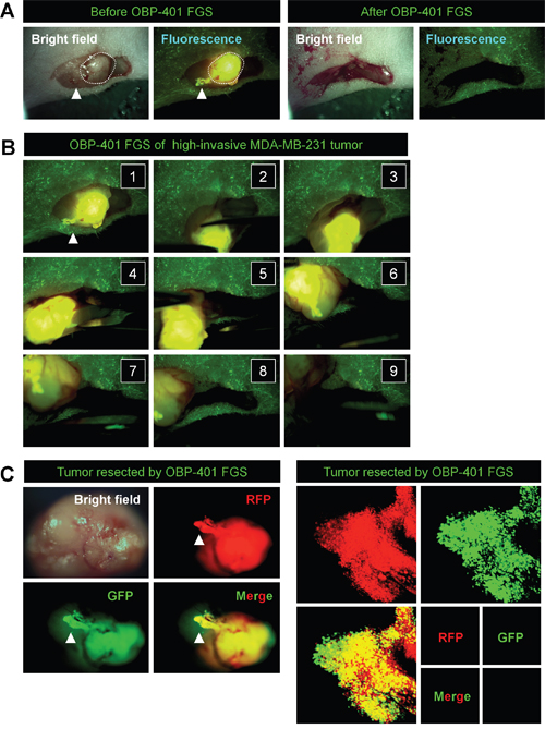 Figure 3: In situ OBP-401 GFP-labeling visualizes invading cancer cells and enables complete resection of high-invasive MDA-MB-231-RFP. A. Representative high-magnification images of high-invasive MDA-MB-231-RFP before and after OBP-401 FGS using the hand-held fluorescence Dino-Lite scope. B. Step-by-step procedure of OBP-401 FGS for high-invasive MDA-MB-231-RFP (see Supplementary Movie S1). C. Representative images of en bloc tumor resected by OBP-401 FGS. Representative images of invading cancer cells resected by OBP-401 FGS visualized at the single-cell level using a confocal laser-scanning microscope (FV1000, Olympus, Tokyo, Japan).