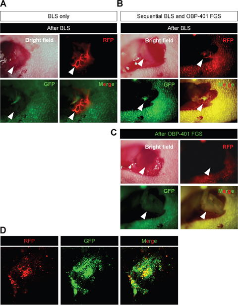 Figure 4: Sequential BLS and OBP-401 FGS of high-invasive MDA-MB-231-RFP. OBP-401 was injected intaratumorally at 1 × 108 PFU when tumors reached approximately 10 mm3 (diameter; 3 mm). The labeled orthotopic tumor was initially resected by BLS and then residual tumor was resected by FGS. A. Representative high-magnification images of invading cancer cells in a lymphatic duct after BLS. B. Representative macroscopic images of incomplete resection of the tumor after BLS (before OBP-401 FGS). C. Representative high-magnification images of surgical area after sequential BLS and OBP-401 FGS. D. Representative microscopic image of resected residual tumor after OBP-401 FGS acquired with confocal laser scanning microscope FV1000 (Olympus, Japan).