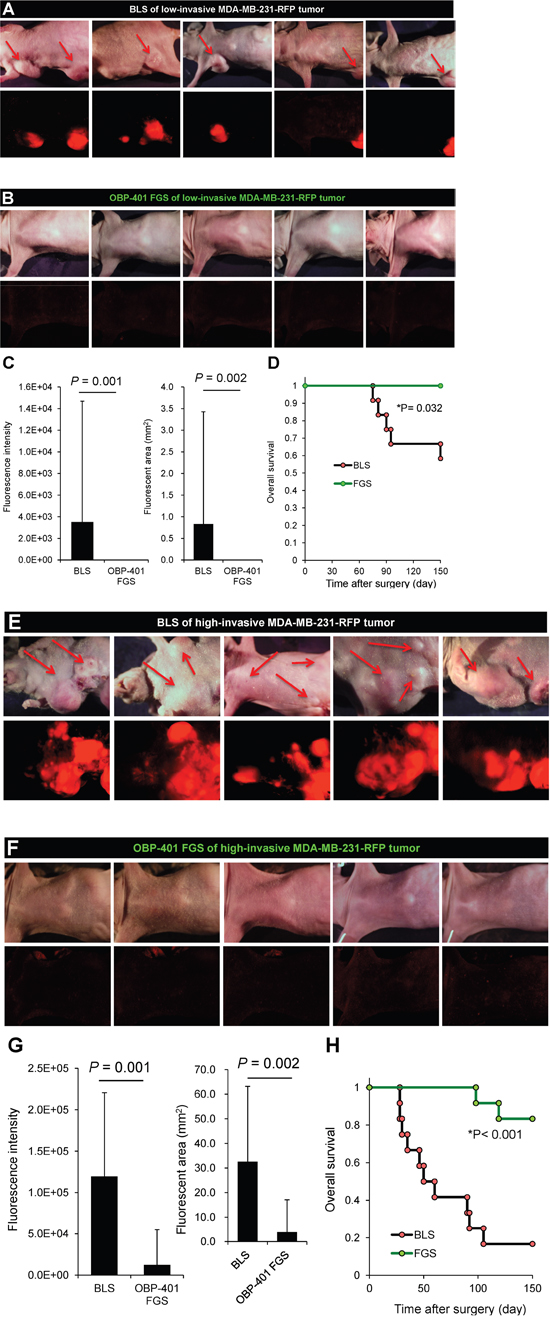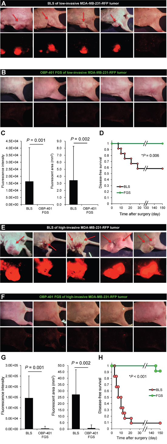 Figure 5: OBP-401-based FGS controls local recurrence of high- and low-invasive MDA-MB-231-RFP. A. Representative whole-body images 150 days after BLS of low-invasive MDA-MB-231-RFP. Arrows indicate growing tumors. B. Representative whole body images 150 days after OBP-401 FGS for low-invasive MDA-MB-231-RFP. C. Comparison of fluorescent area of local recurrent tumors after BLS or OBP-401 FGS for low-invasive MDA-MB-231-RFP (right). Comparison of fluorescence intensity of local and metastatic tumors after BLS or OBP-401 FGS for low-invasive MDA-MB-231-RFP (left). D. Kaplan-Meyer shows disease-free survival after BLS or OBP-401 FGS for low-invasive MDA-MB-231-RFP. E. Representative whole-body images 120 days after BLS for high-invasive MDA-MB-231-RFP. Arrows indicate growing tumors. F. Representative whole-body images 120 days after OBP-401 FGS of high-invasive MDA-MB-231-RFP. G. Comparison of fluorescent area of local recurrent tumors after BLS or OBP-401 FGS for high-invasive MDA-MB-231-RFP (right). Comparison of fluorescence intensity of local recurrent tumors after BLS or OBP-401 FGS for high-invasive MDA-MB-231-RFP (left). H. Kaplan-Meyer curve shows disease-free survival after BLS or OBP-401 FGS for high-invasive MDA-MB-231-RFP. Fluorescent area and fluorescence intensity were calculated with ImageJ software. Data are shown as average ± SD.