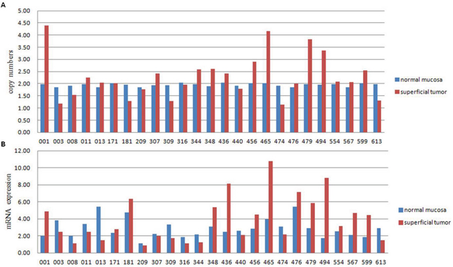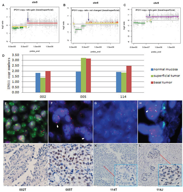 gDNA was isolated by phenol-chloroform extraction after freezing of the tissues in nitrogen. Copy number verification of IPO11 in 5q12.1 was performed using real-time qPCR for the tissue samples from the 3 sequenced patients and an additional 25 BCa patients who had undergone radical cystectomy. The following three primer pairs were designed to amplify regions covering the full length of IPO11, from the C-terminus to the N-terminus, referred to as P1 to P3, using NCBI’s primer designing tool Primer-Blast (http://www.ncbi.nlm.nih.gov/tools/primer-blast/): P1 (forward, TCCCAGACAGTGGCCTGAACT and reverse, CAGCAAGTCGTTTAGATGCCAGT), P2 (forward, CGCAGTAGGTCTATGCCAGTCC and reverse, TTCTTGCGAACCATCCAAATGA), and P3 (forward, TAACCCAGCCTGCCGTTTGTA and reverse, GAAGGGCCCCCTCATAAATATAAAA). Three housekeeping genes, POLR2A, POP1 and RPP14, were used as reference genes for normalization of possible variations in DNA concentrations and differences in DNA quality among the samples. qPCR was performed with SYBR® Premix Ex Taq™ (Takara Bio Inc., Shiga, Japan) using an ABI 7900 System (Applied Biosystems, USA). The 2−ΔΔCT method was used to calculate the relative expression of IPO11 compared with that of the reference genes. The absolute copy number of IPO11 was determined using the equation 2×2−ΔΔCT.