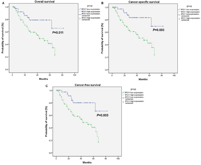 The samples from the 3 sequenced patients and 114 BCa patients with follow-up data were subjected to IHC staining. Two consecutive 4 mm-thick sections were obtained for IHC assays. Importin-11 expression was assessed using a polyclonal rabbit antibody (14403-1-AP; Proteintech, Chicago, IL, USA). Optimal staining was achieved at a 1:50 antibody dilution. Bound primary antibodies were visualized using an Envision Plus system (Dako, Glostrup, Denmark). Importin-11 expression was observed in the nuclei or cytoplasm or both. Evaluation of importin-11 staining included scoring of the staining intensity (0, 1+, 2+ and 3+) and determination of the percentage of positive tumor cells for each slide. A final IHC score was calculated according to these parameters, indicating negative, weak, moderate or strong staining, as described previously [32].