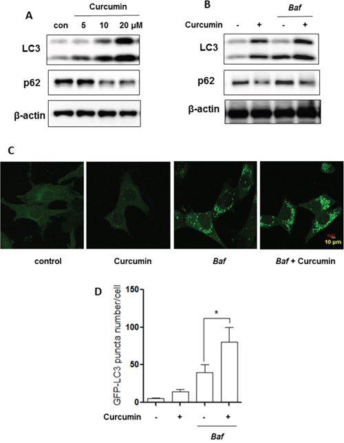 Figure 1: Curcumin induces autophagy. A. HCT116 cells were treated with Curcumin (5, 10 or 20 μM) for 12 hours. B. HCT116 cells were treated with Curcumin (10 μM, 12 hrs) in the presence or absence of bafilomycin A1 (Baf, 15 nM). Cells were harvested for western blotting to determine LC3-II and p62 level. β-actin was used as a loading control. C. and D. Mouse embryonic fibroblasts (MEFs) with stable expression of GFP-LC3 were treated with Curcumin (20 μM, 12 hrs) with or without bafilomycin A1 (Baf, 15 nM) and GFP-LC3 puncta in treated cells was measured and quantified by confocal microscopy (Scale bar 10 μm). All values are means ± SD at least 3 independent experiments. Student’s t test, * P < 0.05.