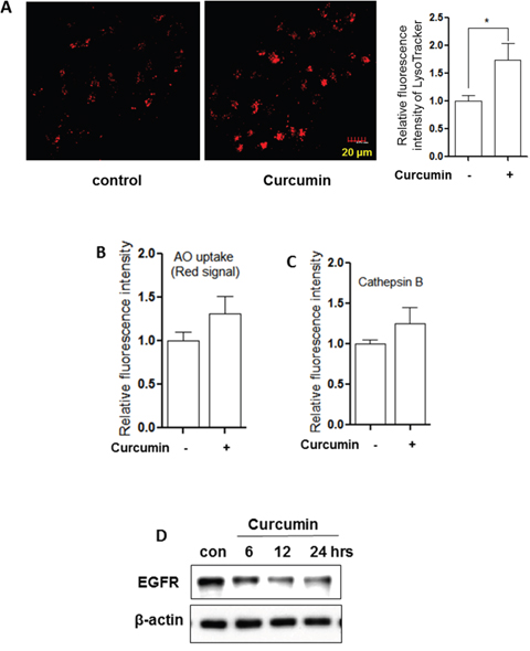 Figure 2: Curcumin activates lysosomal function. A. HCT116 cells were treated with Curcumin (10 μM) at indicated concentration for 12 hours and then stained with LysoTracker Red DND-99 (50 nM) for 15 minutes. Fluorescence intensity of treated cells was measured by confocal microscopy (left) or flow cytometry (right). The numeric data are presented as means ± SD from 2 independent experiments. Student’s t-test, * P < 0.05. B. and C. as indicated in A., after 12 hour treatment, AO staining and Magic Red (Cathepsin B) were performed and analysed using flow cytometry. D. HCT116 cells were treated with Curcumin (10 μM) for different time (6, 12 or 24 hrs) and EGFR was analysed using western blotting. β-actin was used as a loading control.