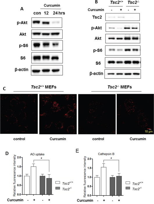 To further establish the role of mTOR in regulating lysosomal function, we utilized the Tsc2-/- MEFs in which the mTOR is constitutively active [38]. In Figure 3B, Curcumin treatment for 12 hours failed to suppress mTOR activity in the Tsc2-/- MEFs (no reduction of both phospho-Akt and phospho-S6). Meanwhile, in Tsc2-/- MEFs, LysoTracker staining (Figure 3C), AO staining (Figure 3D) and Magic Red Cathepsin B staining (Figure 3E) showed that Curcumin treatment failed to increase the cells’ fluorescence intensity, suggesting that Curcumin is unable to induce lysosomal activation in Tsc2-/- MEFs. These results thus indicate lysosomal activation by Curcumin is most probably mediated via its suppressive effects on mTOR.