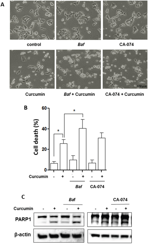 Figure 5: Lysosomal inhibition sensitizes curcumin-induced cell death. HCT116 cells were treated with Curcumin (20 μM), with or without bafilomycin A1 (Baf, 25 nM) or CA-074 (25 μM) for 24 hours. A. Morphological changes of HCT116 cells with respective treatments were examined and photographed with an inverted microscope (Scale bar 200 μm). B. Cell pellets were subsequently collected and cell death was quantified using propidium iodide (PI) exclusion staining. Statistical significance (* P < 0.05) is indicated in the bar chart. C. Cells were then harvested for protein analysis. Cell lysates were resolved in SDS-PAGE and probed with specific antibody against PARP1.