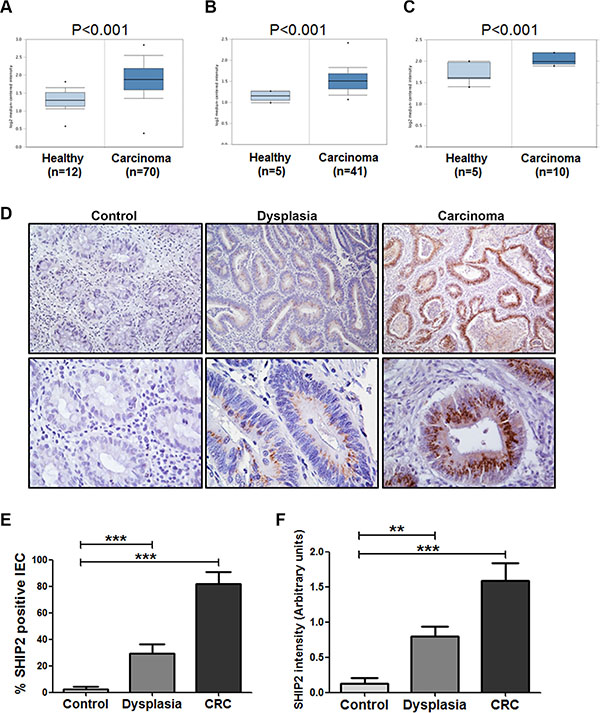 Figure 1: INPPL1 mRNA and SHIP2 protein expression are increased in colorectal dysplasia and carcinoma as compared to non-dysplastic tissue. (A–C) Using publicly available gene expression data from Oncomine, INPPL1 expression was analyzed in carcinoma tissue compared to adjacent normal colon tissue. Shown are the significant upregulation of INPPL1 in CRC in datasets from Hong et al. (A), Kaiser et al. (B) and Skrzypczakand et al. (C). (D) Tissues of patients dysplasia (n = 14), colorectal cancer (CRC, n = 11), and controls (inactive ulcerative colitis, n = 8), were stained for SHIP2 by immunohistochemistry. Representative examples (10× and 40× magnification) are shown. (E, F) SHIP2 staining was scored for percentage of positive intestinal epithelial cells as well as intensity of staining. (**p > 0.01; ***p > 0.001).
