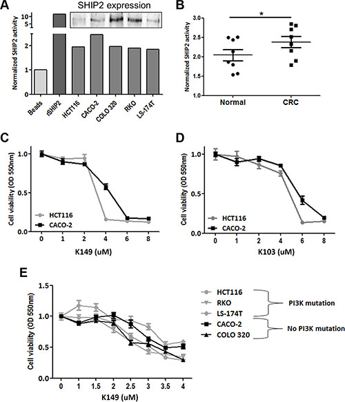 Phosphatases have long been regarded as undruggable tumor suppressor genes. However this dogma is currently changing as more data suggests that phosphatases do not only terminate cellular signaling, but can also promote signal transduction. In this study we identified the lipid phosphatase SHIP2 as an oncogene and potential treatment target in colorectal cancer. We show that the expression of this inositol phosphatase is increased in colorectal cancer tissue as compared to (adjacent) non-cancerous samples. This upregulation appears to be mediated on a transcriptional level, since mRNA levels of the SHIP2 encoding gene INPPL1 are also increased in colorectal carcinoma samples. By comparing a large cohort of colorectal cancer patients, we found that patients with high SHIP2 expressing tumors have a poor outcome with earlier recurrence and reduced time to death. Together, these data suggest that SHIP2 increases the oncogenic potential of colonic epithelial cells. This fits well with previous reports, showing that SHIP2 expression is increased in breast cancer samples [29, 30] and that treatment of breast cancer cell lines with SHIP2 inhibitors results in cell death [13]. Other studies have also confirmed overexpression of SHIP2 in CRC, laryngeal squamous cell carcinoma and non-small lung cell cancer [31–33]. Importantly, we now show that the enzymatic activity of this phosphatase is also increased in colorectal cancer as compared to adjacent normal tissue, providing rationale for the treatment of this tumor type with SHIP2 activity inhibitors. Indeed, treatment of two colorectal cancer cell lines with a previously described SHIP2 inhibitor [34] and a novel analog resulted in a dose-dependent cell killing. Since we found HCT116 to be more sensitive to SHIP2 inhibition than CACO-2 cells, we hypothesized that this could be due to differences in their mutational background. It is known that tumors which harbor mutations in a particular pathway can become “addicted” to this pathway, and therefore become more sensitive to targeting of this signaling route [35]. Conversely, it has also been suggested that harboring a mutation in a particular gene renders tumors insensitive to inhibitors of signaling moieties downstream thereof [36]. While HCT116 cells harbor an activating mutation in the PIK3CA gene, CACO-2 cells do not. However upon comparison of 5 different CRC cell lines we could not relate the differences in sensitivity to SHIP2 inhibition to PIK3CA mutational status, suggesting that SHIP2 inhibition could be a target for treatment of CRC, irrespective of variation in their existing mutations. Likewise, in our TMA cohort, SHIP2 expression did not correlate to the mutational status of PIK3CA. However, although we have previously described selectivity of the K103 compound for SHIP1 and SHIP2 over the lipid phosphatase OCRL, we cannot formally exclude that these compounds have other, SHIP independent effects in the cell that may account for the lack of correlation to PIK3CA status of cells.
