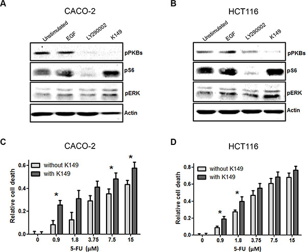 Figure 4: SHIP2 inhibition interferes with cancer signaling pathways, and sensitizes to 5-fluorouracil (5-FU) treatment. (A, B) Treatment of CACO-2 and HCT116 cells with K149 results in decreased PKB phosphorylation, and increased pS6 phosphorylation. In contrast, control treatment with the PI3K inhibitor LY2940002 reduces both PKB phosphorylation and its downstream target pS6. ERK phosphorylation is affected by neither inhibitor. (C, D) 5-FU kills colorectal cancer cells in a dose dependent manner. In the presence of low concentrations of SHIP2 inhibitor, 5-FU-induced cell death is enhanced, in particular with low concentrations of 5-FU (*p < 0.05).