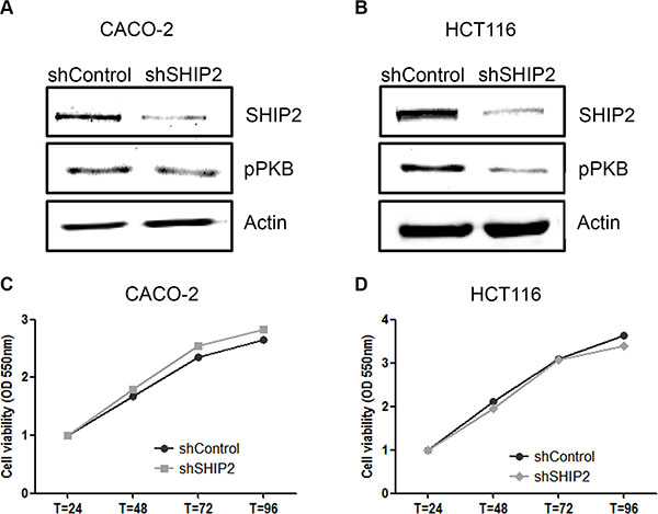 Figure 5: Stable knockdown of SHIP2 influences PKB signaling, without affecting cell proliferation. (A, B) Lentiviral transduction of SHIP2 shRNA resulted in 80% reduction of SHIP2 expression levels, and reduces PKB phosphorylation as shon by western blot analysis. (C, D) Using MTT assays, cell proliferation was assessed, and no effect of SHIP2 knockdown was observed.