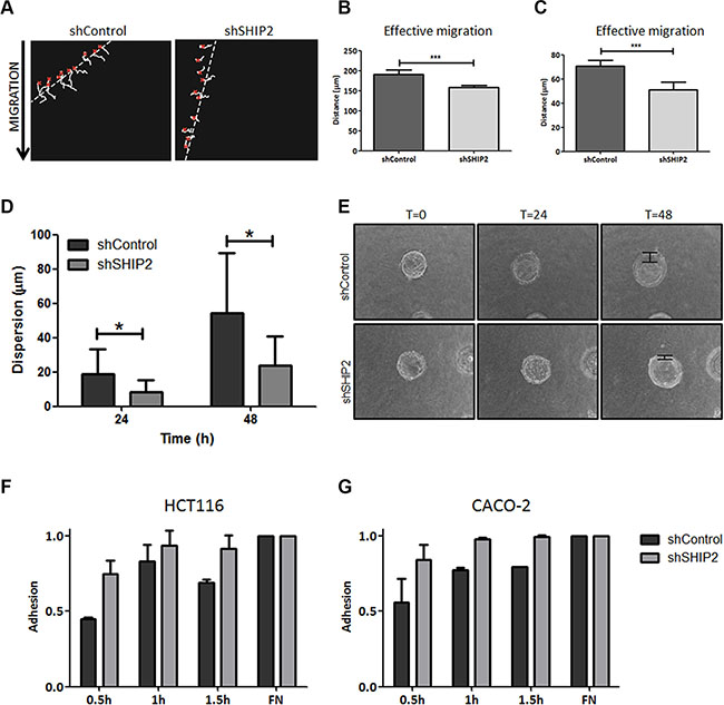 Figure 6: Modulation of SHIP2 expression affects migration, invasion, and adhesion in colorectal cancer cells. (A) Cell migration was measured using a ring-barrier system. HCT116 cell migration on gelatin was tracked during 24 h, with locations being captured using time-lapse microscopy every 12min (x = start, line = cell track). (B, C) Quantification of migrated path indicates that the total migration and effective migration were significantly reduced in SHIP2 knockdown cells. (***p < 0.001). (D) Beads were coated with either HCT116 SHIP2 knockdown or control cells for 24 hours, and embedded in a collagen gel matrix. Cells were allowed to invade the collagen matrix, and pictures were taking at 0 h, 24 h, and 48 h (examples in E). The cell dispersion from the bead (arrow) into the collagen matrix was measured, and a trend towards reduced invasion was observed in SHIP2 knockdown cells. Data represents at least four beads. (p ≤ 0.05) (F, G) CRC cell adhesion was determined by MTT assay of adherent cells after indicated time points, with fibronectin (FN) coating serving as control. SHIP2 knockdown cells adhere more efficient to culture plates compared to non-target control.